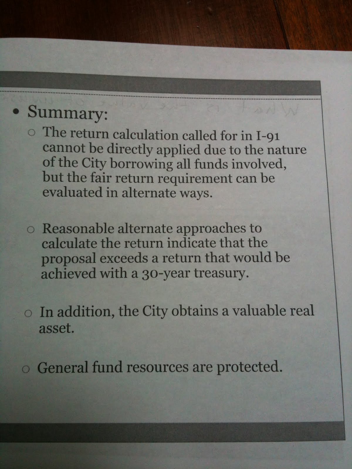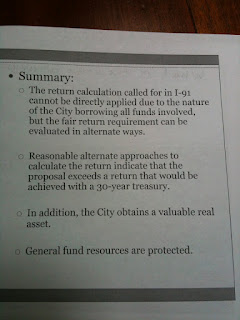 As it turns out, if the city doesn't invest actual cash then expecting a rate of return (2.7%, Treasury Bill, I-91 requirement) lower than the rate you used the borrow the money (about 5.5% bond rate) you lose money.